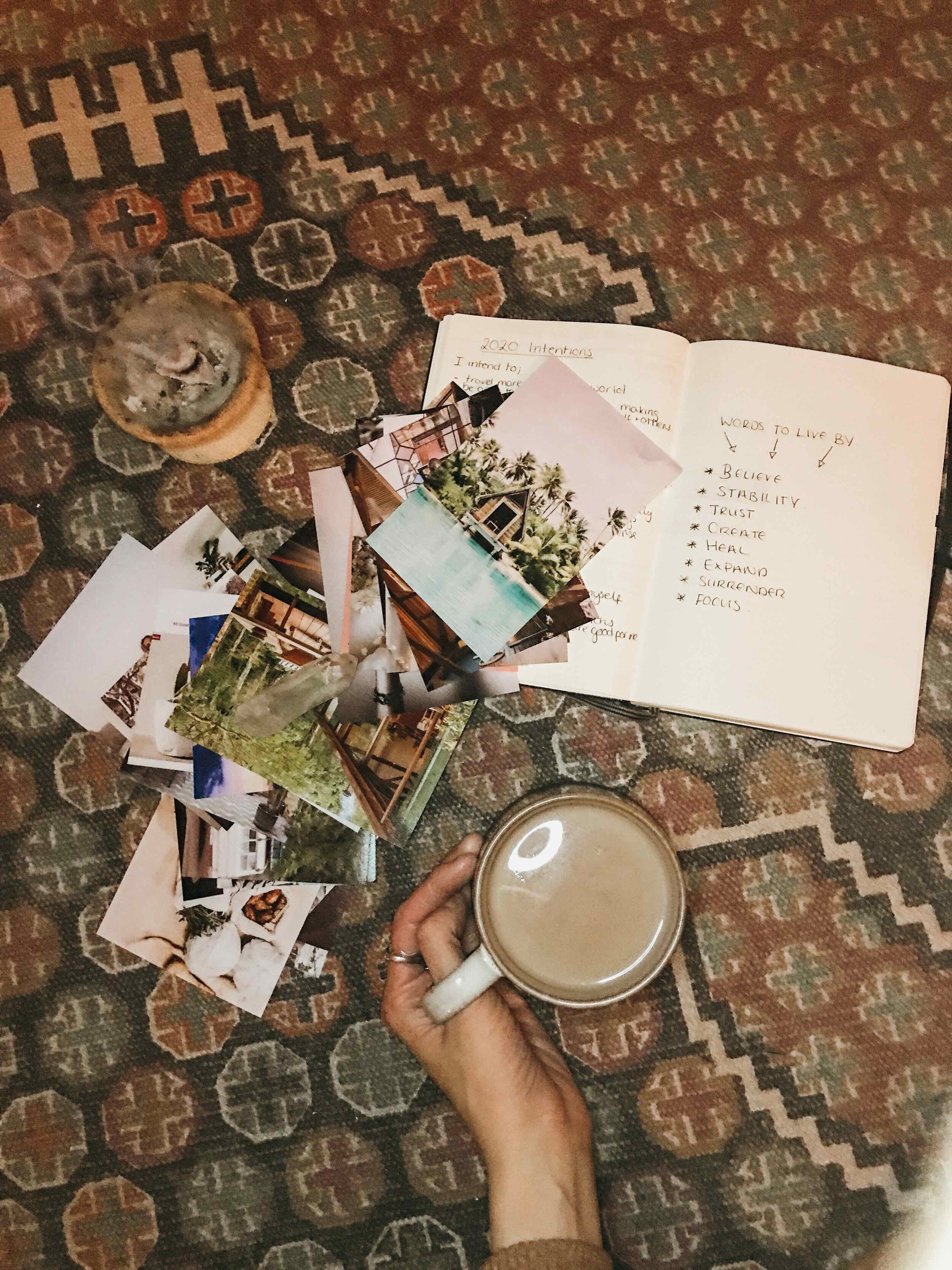 Bringing yourself back to earth for a minute after all that blue sky dreams and intentions….take a minute to look over your goals and intentions, and then thinking about where you right now realistically. Are there things you can easily put in place, daily or monthly practices that will help you start working towards these goals, or make it easier to live by your intentions.